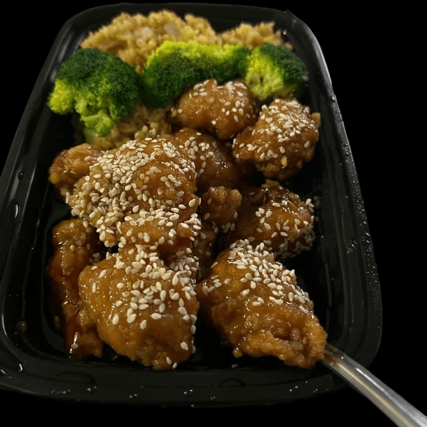 Chicken, shrimp, beef with baby corn, broccoli, straw mushrooms in chef's special sauce
